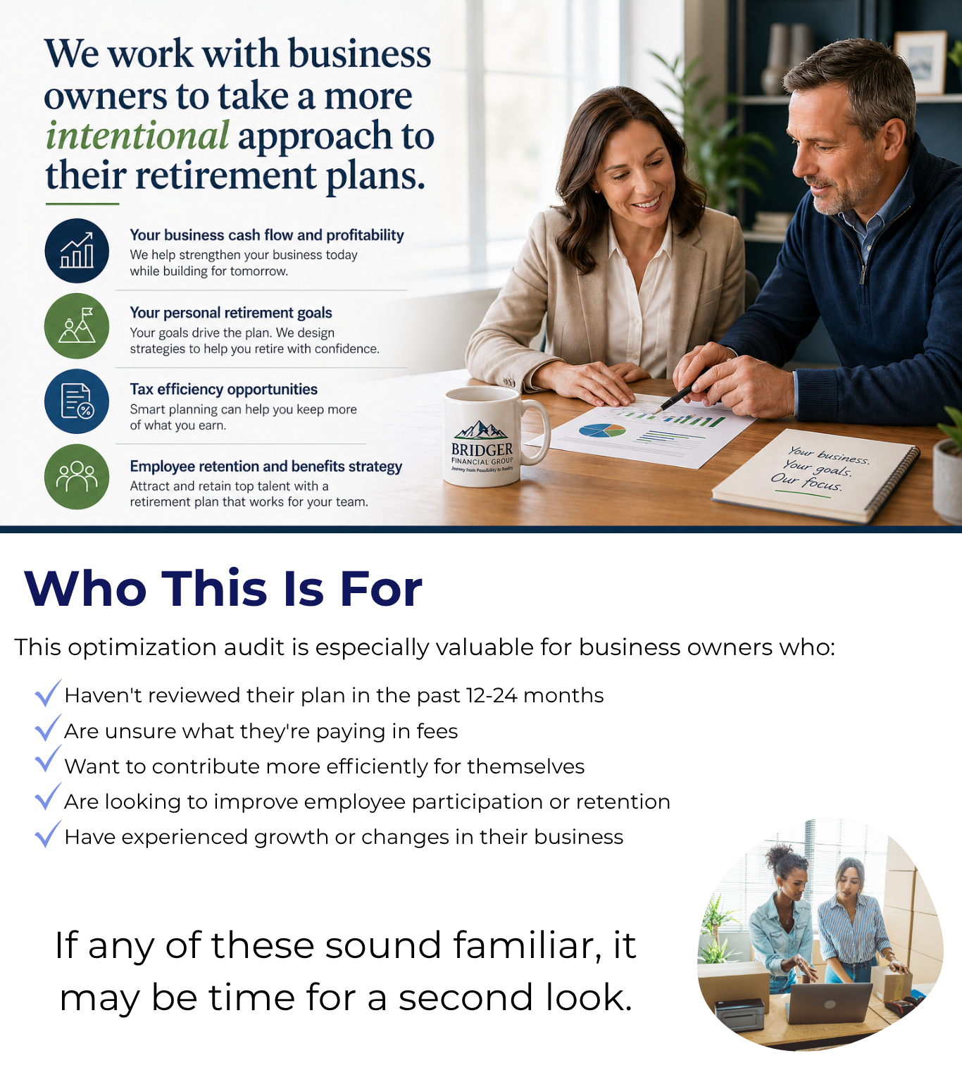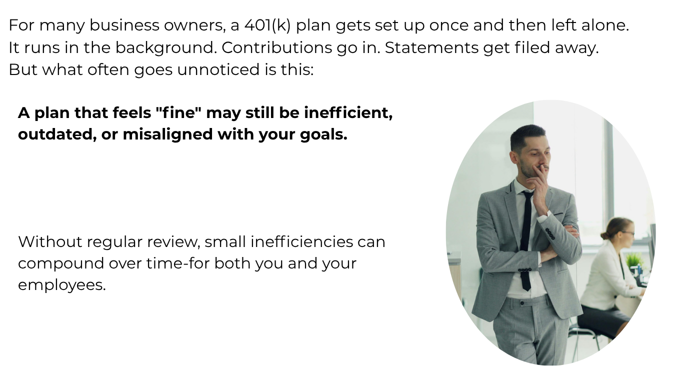 Schedule a complimentary 401(k) evaluation and get a clear understanding of where your plan stands-and where it could be improved.